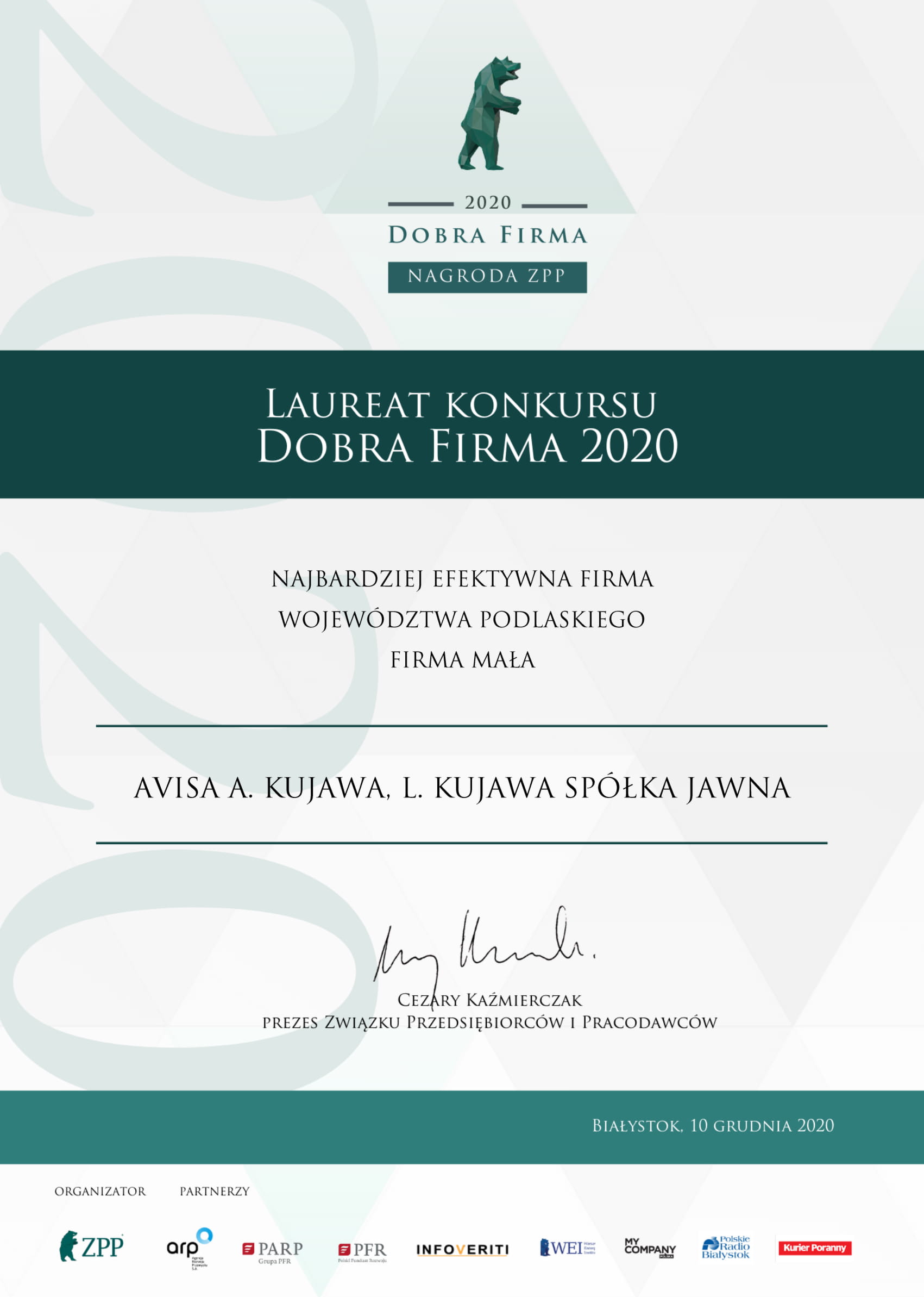 Z dumą informujemy, iż zostaliśmy laureatem konkursu organizowanego przez Związek Przedsiębiorców i Pracodawców „Dobra Firma 2020” w kategorii „Najbardziej efektywna firma województwa podlaskiego” Firma mała. Tym zaszczytnym tytułem zostały uhonorowane spółki z województwa podlaskiego, których działania w dziedzinie przedsiębiorczości, zarządzania i innowacyjności zasługują na szczególne uznanie. Laureaci zostali wyłonieni w sposób obiektywny, oparty na twardych kryteriach finansowych. Małe i średnie przedsiębiorstwa są solą polskiej gospodarki. Tworzą znaczną część polskiego PKB i zatrudniają łącznie największą liczbę pracowników. Przykład Państwa firmy - lidera biznesu pokazuje, jak efektywne działania i potencjał pracowniczy przyczyniają się do rozwoju regionu i tworzą miejsca pracy.